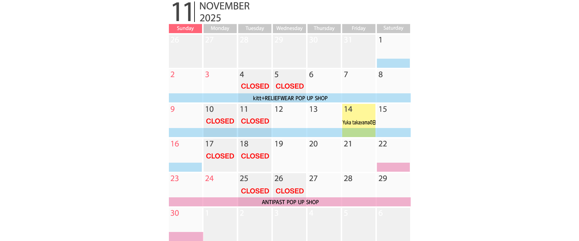 11/1(土)~16(日) 12:00~18:00 4(火)・5(水)・10(月)・11(火)は定休日です。